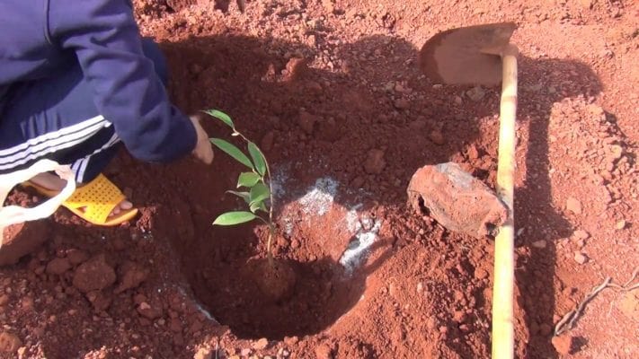 Khi lấp đến 2/3 chiều cao hố, tưới nước đẫm để đất lắng xuống rồi tiếp tục lấp phần còn lại.