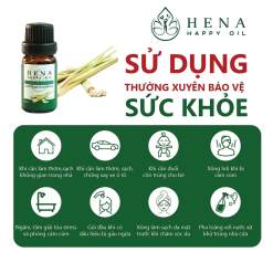 – Với khả năng khử mùi, diệt khuẩn, làm lành vết thương cũng như thư giãn tinh thần, giải tỏa căng thẳng; tinh dầu sả chanh Hena là một trong những sản phẩm được ưa chuộng tại các spa cũng như gia đình. Ngoài ra, tinh dầu sả chanh còn được sử dụng để thêm vào kem dưỡng da, cho vào nước lau nhà, hay bồn tắm để ngâm mình…
